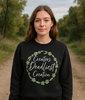 A sacred sage hand-painted Anishinaabe floral wreath frames the striking white text on a women's boxy, slightly cropped crewneck. Crafted from 100% cotton and recycled polyester for ultimate softness. Offered in Raven Black, sizes range from More Deadly (Small) to Extra Deadliest (2XL) with a junior size fit. Each piece is one-of-a-kind due to the hand-painted process. See size chart below.